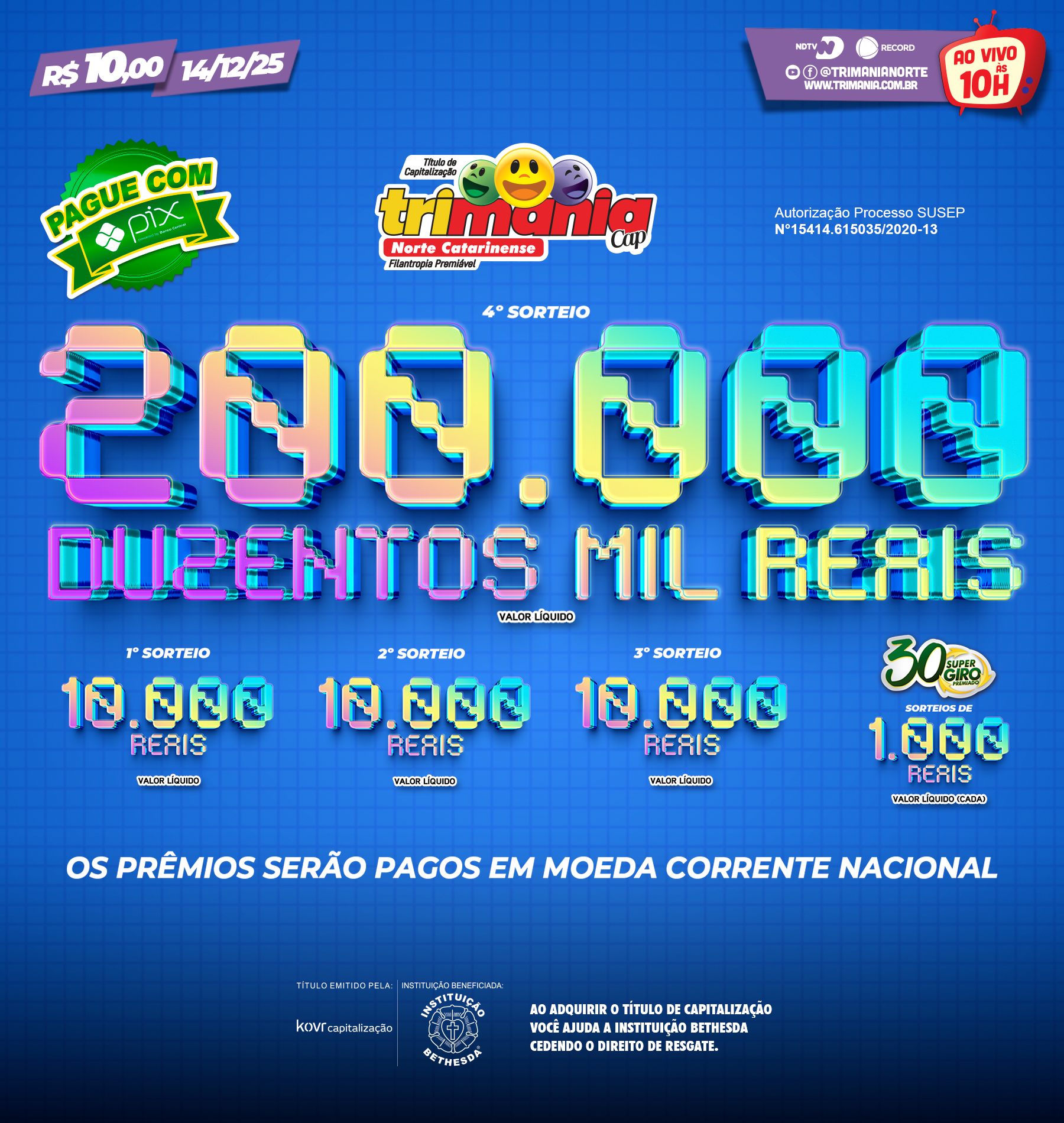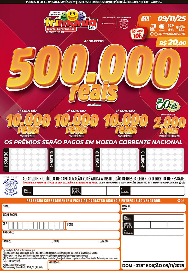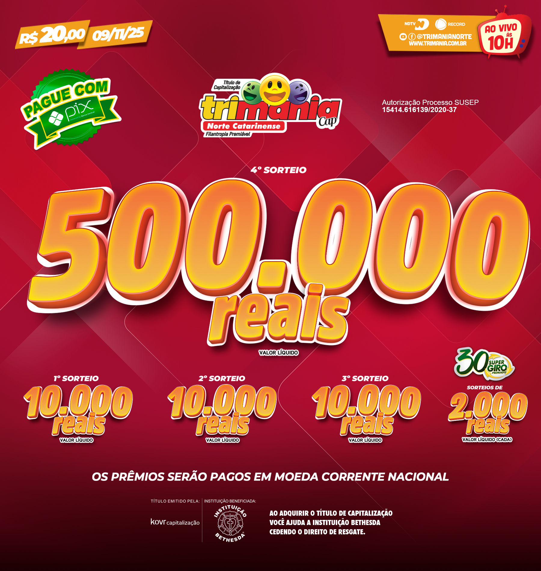 “Sorteios decorrentes de Títulos de Capitalização de Pagamento Único, da Modalidade Filantropia Premiável, emitidos pela KOVR Capitalização S.A, inscrita no CNPJ sob nº 93.202.448/0001-79 e aprovados pela SUSEP. Você pode ajudar a Instituição Bethesda, comprando o Trimania Cap e cedendo o direito de resgate. A aprovação deste Título pela SUSEP não implica, por parte da Autarquia, em incentivo ou recomendação a sua aquisição, representando exclusivamente, sua adequação às normas em vigor. Antes de contratar, consulte previamente as Condições Gerais.”