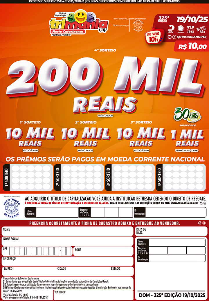 “Sorteios decorrentes de Títulos de Capitalização de Pagamento Único, da Modalidade Filantropia Premiável, emitidos pela KOVR Capitalização S.A, inscrita no CNPJ sob nº 93.202.448/0001-79 e aprovados pela SUSEP. Você pode ajudar a Instituição Bethesda, comprando o Trimania Cap e cedendo o direito de resgate. A aprovação deste Título pela SUSEP não implica, por parte da Autarquia, em incentivo ou recomendação a sua aquisição, representando exclusivamente, sua adequação às normas em vigor. Antes de contratar, consulte previamente as Condições Gerais.”