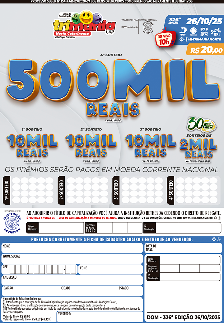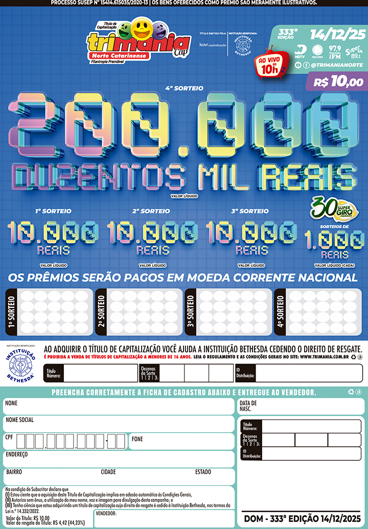 “Sorteios decorrentes de Títulos de Capitalização de Pagamento Único, da Modalidade Filantropia Premiável, emitidos pela KOVR Capitalização S.A, inscrita no CNPJ sob nº 93.202.448/0001-79 e aprovados pela SUSEP. Você pode ajudar a Instituição Bethesda, comprando o Trimania Cap e cedendo o direito de resgate. A aprovação deste Título pela SUSEP não implica, por parte da Autarquia, em incentivo ou recomendação a sua aquisição, representando exclusivamente, sua adequação às normas em vigor. Antes de contratar, consulte previamente as Condições Gerais.”