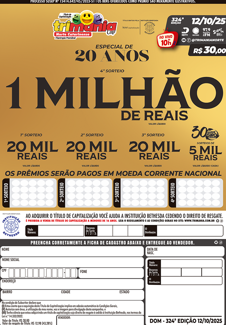 “Sorteios decorrentes de Títulos de Capitalização de Pagamento Único, da Modalidade Filantropia Premiável, emitidos pela KOVR Capitalização S.A, inscrita no CNPJ sob nº 93.202.448/0001-79 e aprovados pela SUSEP. Você pode ajudar a Instituição Bethesda, comprando o Trimania Cap e cedendo o direito de resgate. A aprovação deste Título pela SUSEP não implica, por parte da Autarquia, em incentivo ou recomendação a sua aquisição, representando exclusivamente, sua adequação às normas em vigor. Antes de contratar, consulte previamente as Condições Gerais.”