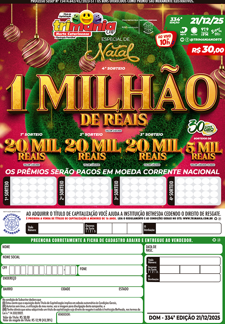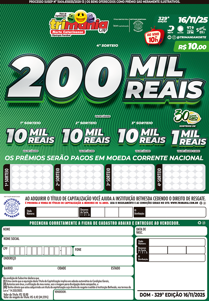 “Sorteios decorrentes de Títulos de Capitalização de Pagamento Único, da Modalidade Filantropia Premiável, emitidos pela KOVR Capitalização S.A, inscrita no CNPJ sob nº 93.202.448/0001-79 e aprovados pela SUSEP. Você pode ajudar a Instituição Bethesda, comprando o Trimania Cap e cedendo o direito de resgate. A aprovação deste Título pela SUSEP não implica, por parte da Autarquia, em incentivo ou recomendação a sua aquisição, representando exclusivamente, sua adequação às normas em vigor. Antes de contratar, consulte previamente as Condições Gerais.”